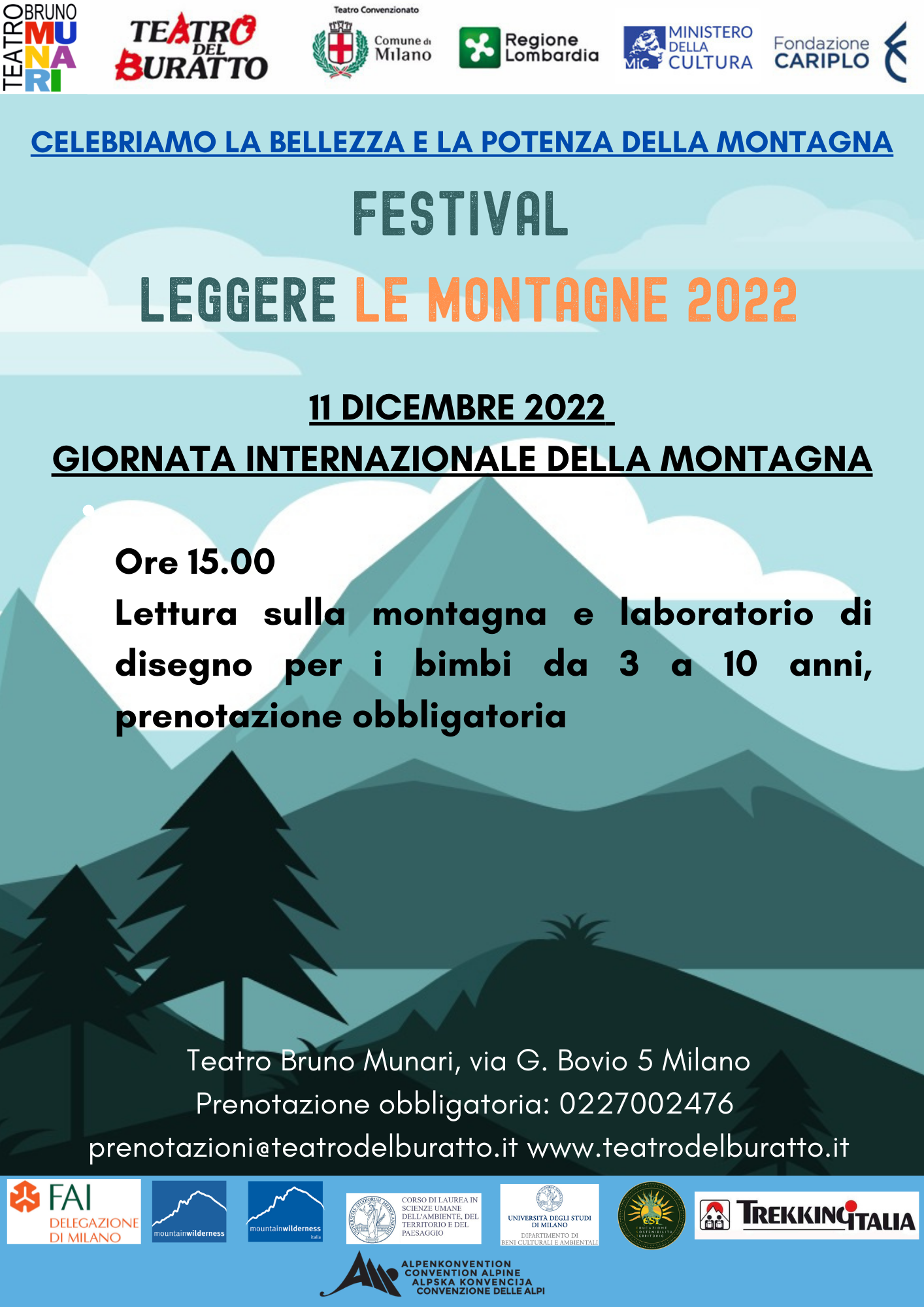 Il Teatro del Buratto, insieme alla cooperativa sociale EST - Educazione Sostenibilità Territorio, Mountain Wilderness, Mountain Wilderness Italia, il FAI – delegazione di Milano, Trekking Italia, il Corso di Laurea in Scienze Umane dell’Ambiente, del Territorio e del Paesaggio, il Dipartimento di Beni Culturali e Ambientali, aderisce per il quarto anno all’iniziativa Leggere le Montagne, proponendo l’evento “IL RESPIRO DELLA MONTAGNA: racconti, immagini e ricordi”. L’evento si terrà Domenica 11 Dicembre, alle ore 11.00, presso il Teatro Bruno Munari di Milano e sarà a ingresso gratuito e aperto a tutta la cittadinanza.